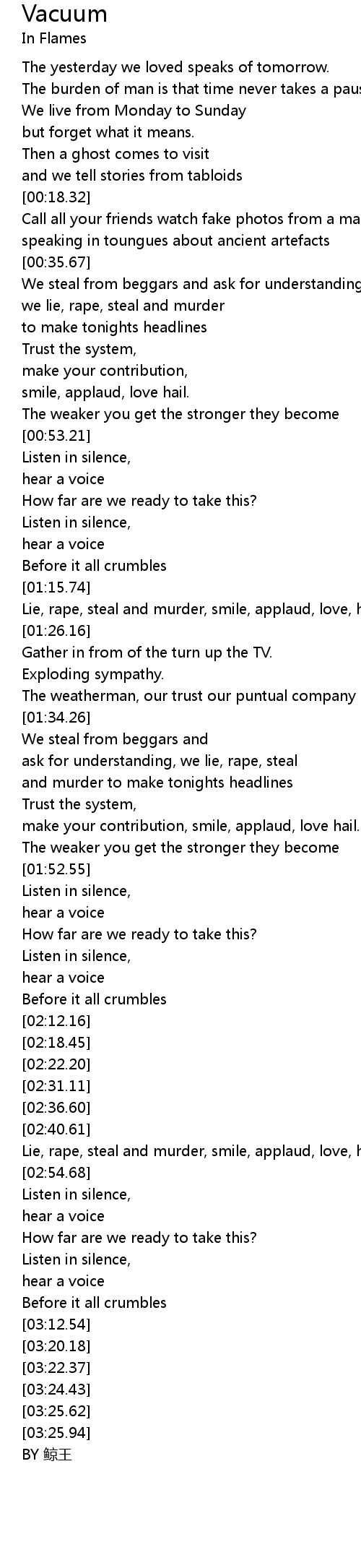 | [02:45.12] | Lie, rape, steal and murder, smile, applaud, love, hail. |