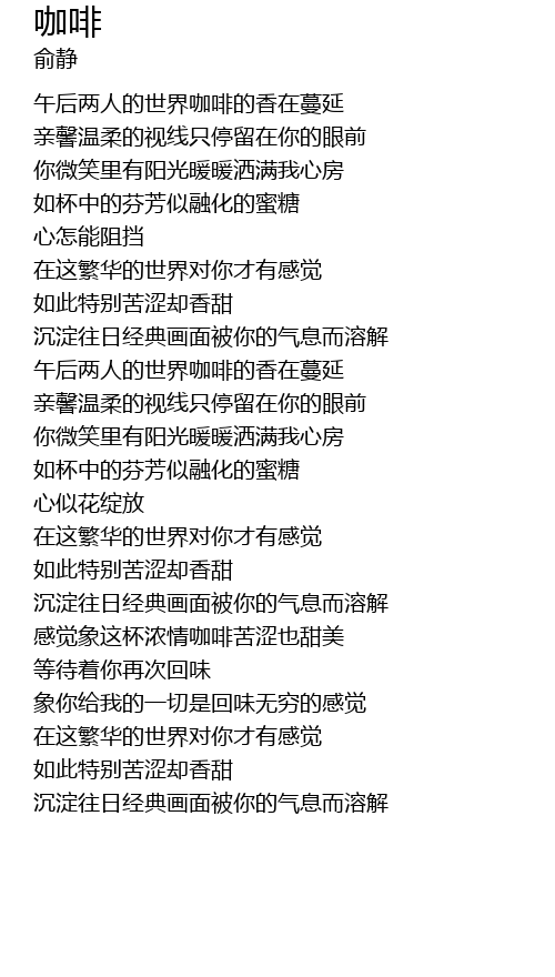 | [00:21.14] | 午后两人的世界咖啡的香在蔓延 |