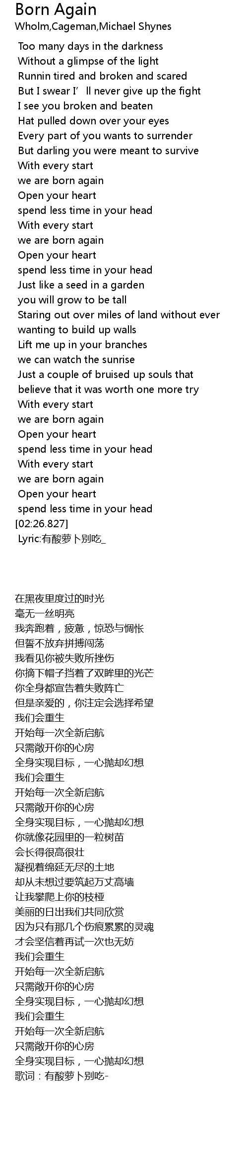 | [02:00.855] | we are born again |