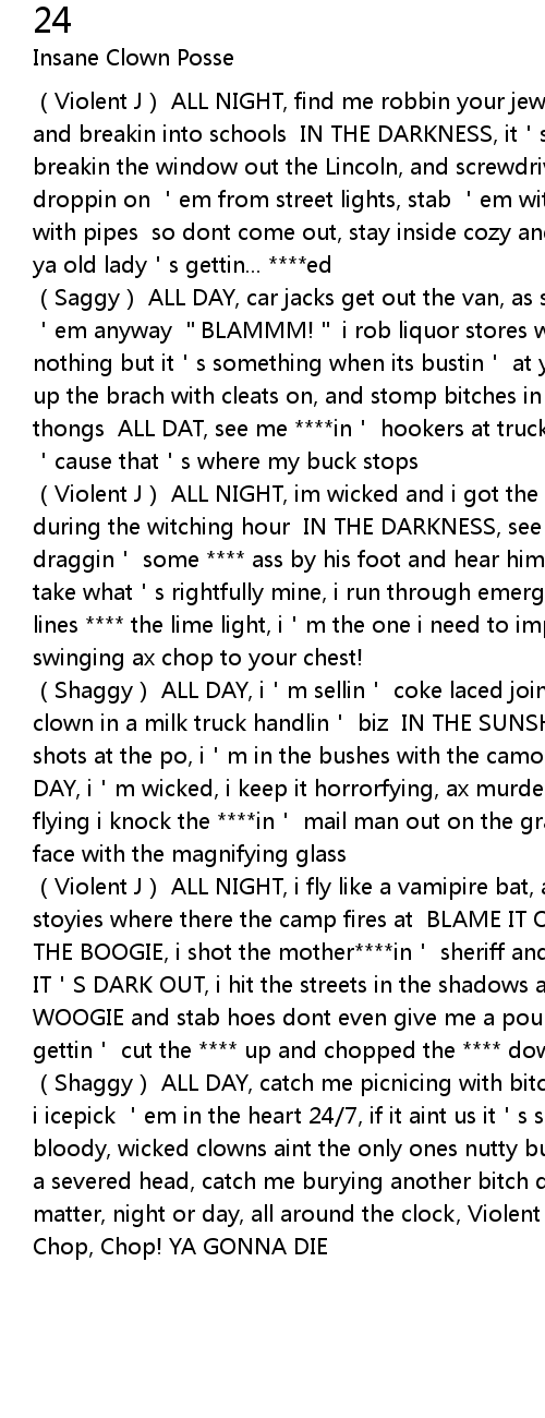 | Shaggy ALL DAY, catch me picnicing with bitches in the park, right before i icepick em in the heart 24 7, if it aint us it s somebody gettin bloody, wicked clowns aint the only ones nutty buddy CATCH ME, TOUNGE KISSIN a severed head, catch me burying another bitch dead behind a shed it doesnt matter, night or day, all around the clock, Violent J and Shaggy Chop, Chop, Chop, Chop! YA GONNA DIE |