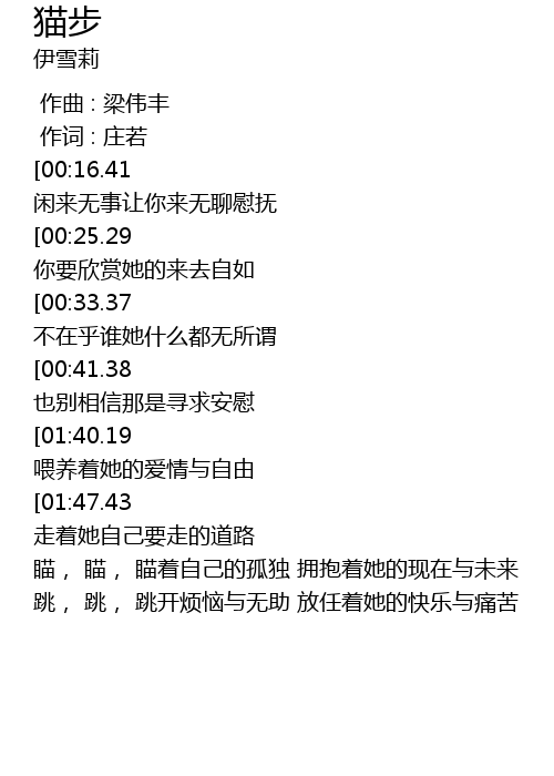 | [02:25.08][01:40.19][00:49.46] | 猫, 猫, 瞄住自己的猫步 喂养着她的爱情与自由 |