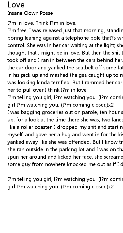 I?m free, I was released just that morning, standing there thinking freedom is boring leaning against a telephone pole that?s when I seen here and lost control. She was in her car waiting at the light; she looked right at me and I thought that I might be in love. But then the shit turned green and she quickly took off and I ran in between the cars behind her. Screaming for HELP! opened the car door and yanked the seatbelt off some fat kid and tossed his ass. Jumped in his pick up and mashed the gas caught up to my love road along the side, she was looking kinda terrified. But I rammed her car and gave her a nudge and told her to pull over I think I?m in love. |