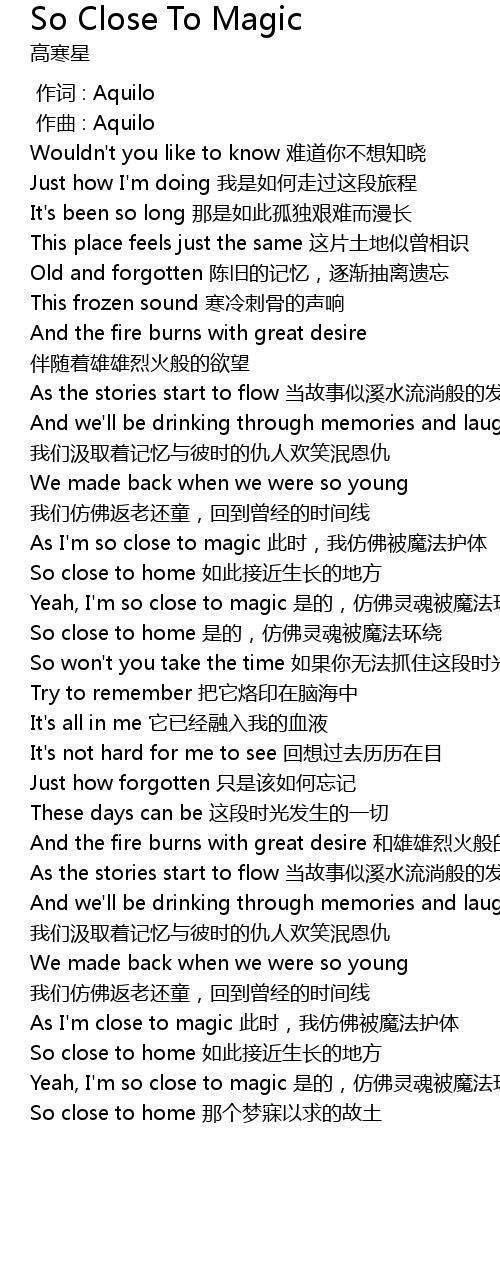 | [02:17.429] | As I'm close to magic 此时,我仿佛被魔法护体 |