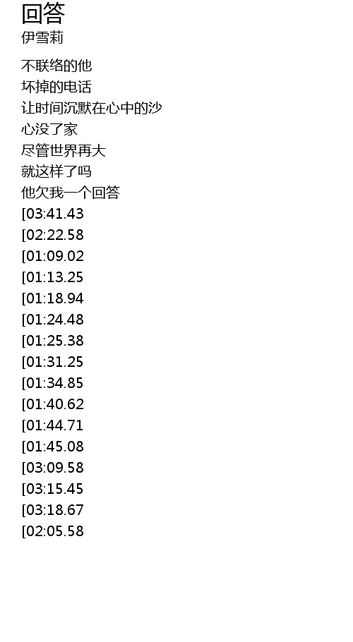 | [03:04.23][01:45.08][03:41.75] | wǒ yào nǐ kàn wǒ yǎn gěi wǒ huí dá |