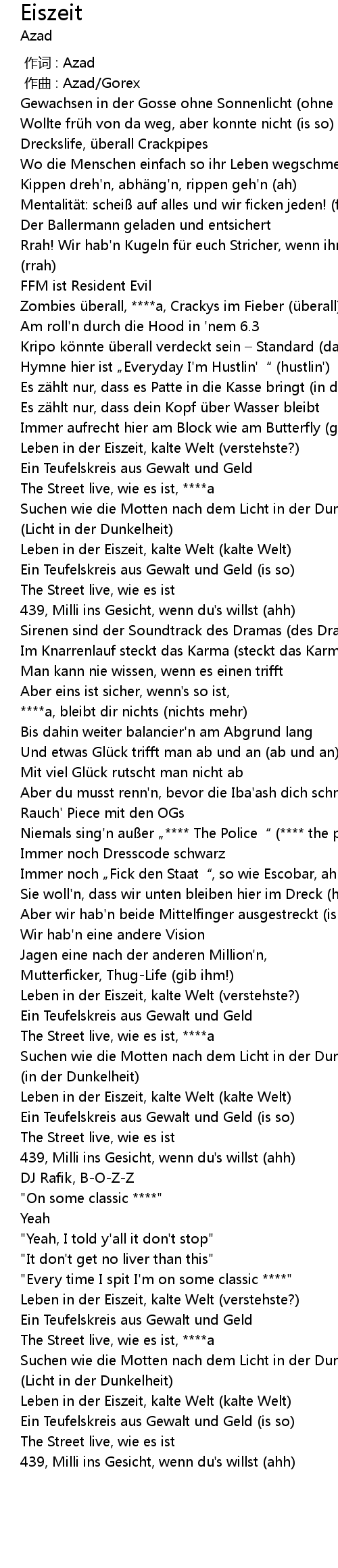 | [01:33.57] | Niemals sing'n außer „**** The Police“ (**** the police) |