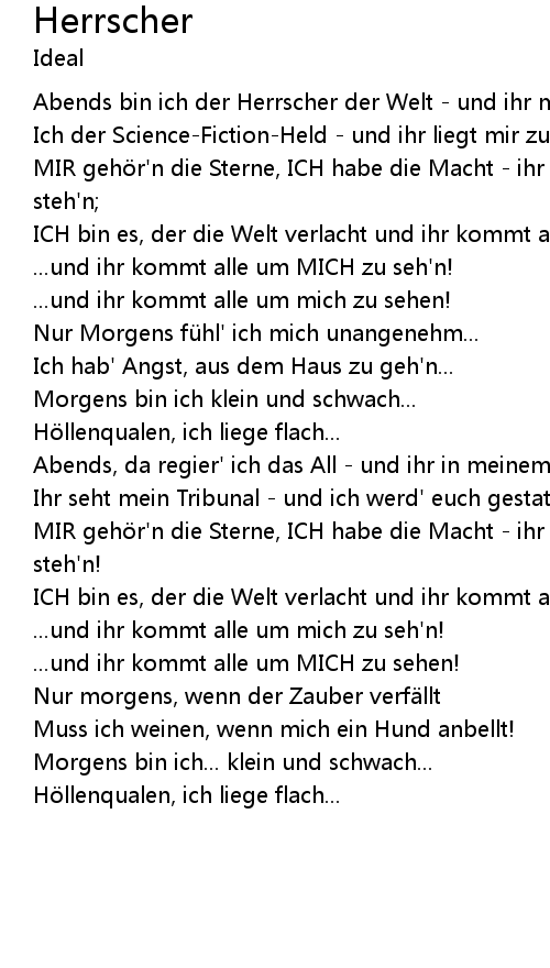 | MIR geh r' n die Sterne, ICH habe die Macht ihr seid froh, in meinem Licht zu steh' n | |