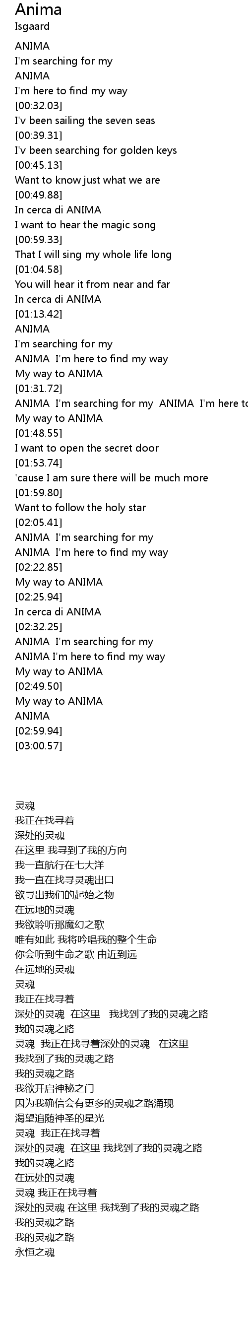 [01:32.93] ANIMA I'm searching for my ANIMA I'm here to find my way