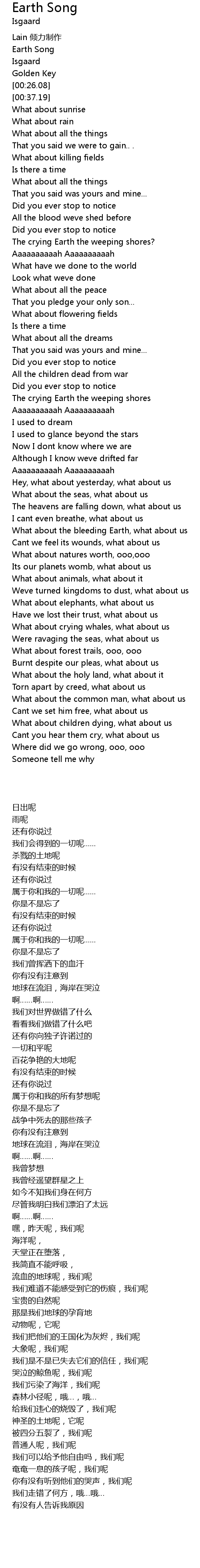 | [01:38.13] | 地球在流泪,海岸在哭泣 |
