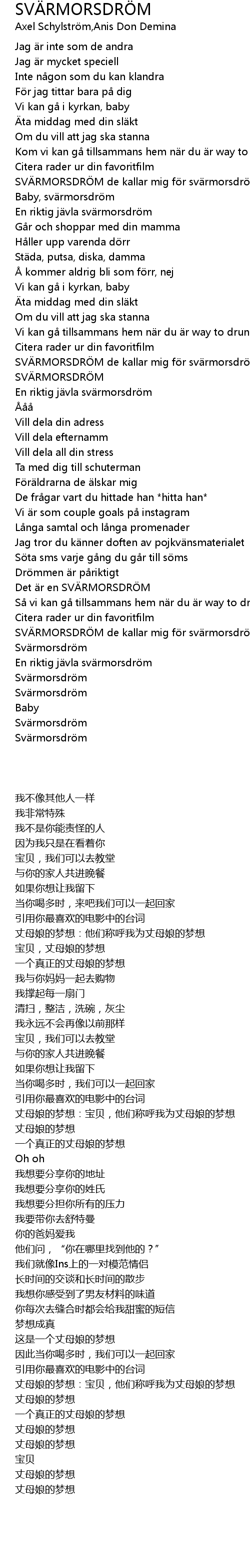 | [00:39.79] | SVÄRMORSDRÖM de kallar mig för svärmorsdröm |