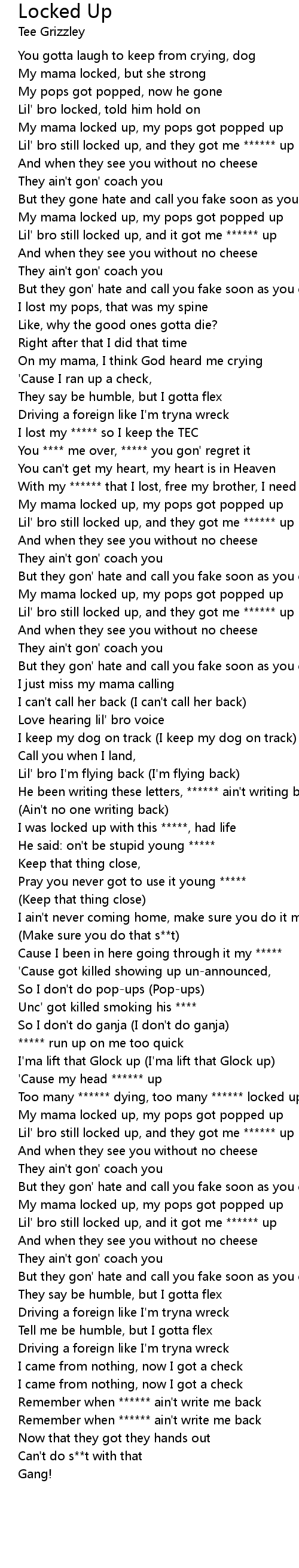 [01:35.77] Lil' bro still locked up, and they got me ****** up