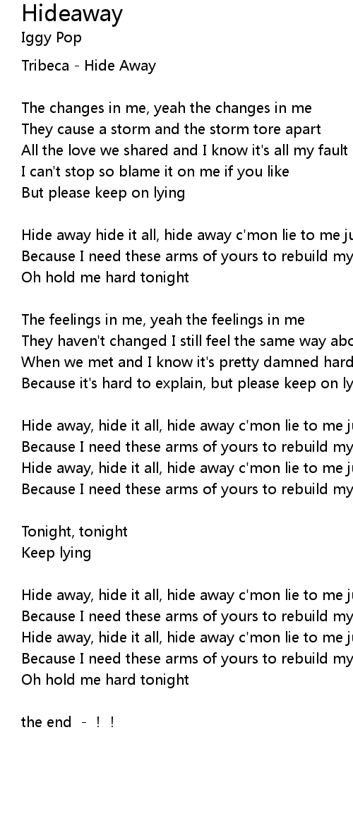 | Hide away, hide it all, hide away c' mon lie to me just on more time | |
