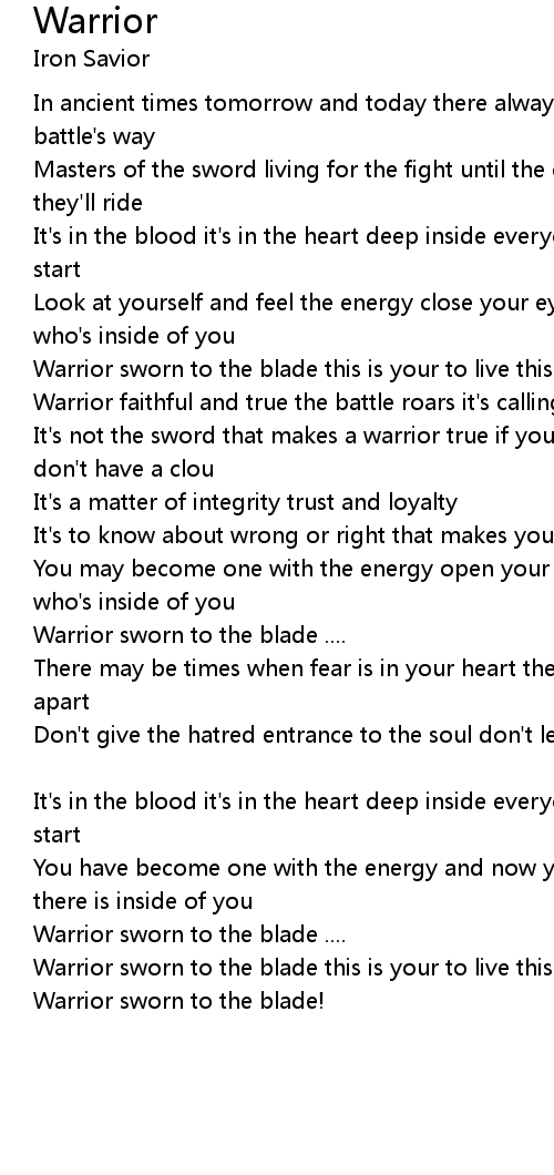 In ancient times tomorrow and today there always be the men who choose the battle's way |