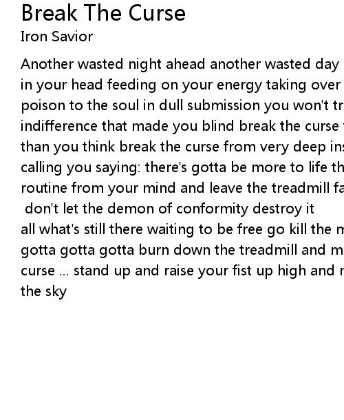 Another wasted night ahead another wasted day stuck in a dead end with a monster in your head feeding on your energy taking over control makes you obey spilling poison to the soul in dull submission you won't track down its hide it's the indifference that made you blind break the curse time is running short shorter than you think break the curse from very deep inside your mind a voice is calling you saying: there's gotta be more to life than you know shake off the routine from your mind and leave the treadmill far behind break the curse ... break it up [solo Piesel - Piet] don't let the demon of conformity destroy it all what's still there waiting to be free go kill the monster in your head you gotta gotta gotta burn down the treadmill and move straight ahead break the curse ... stand up and raise your fist up high and make two fingers pointing to the sky |