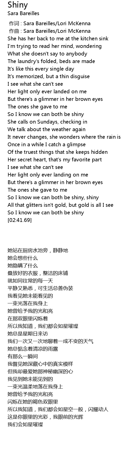| [02:04.47] | So I know we can both be shiny, shiny |
