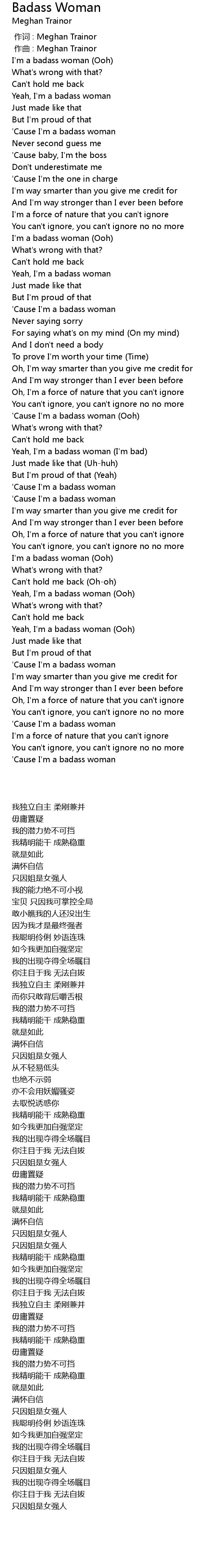 | [01:42.32] | ' Cause I' m a badass woman Ooh |
