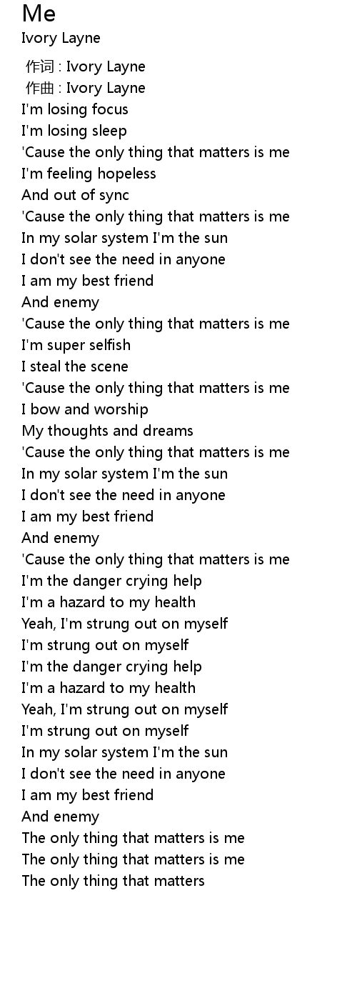 | [00:45.101] | ' Cause the only thing that matters is me |