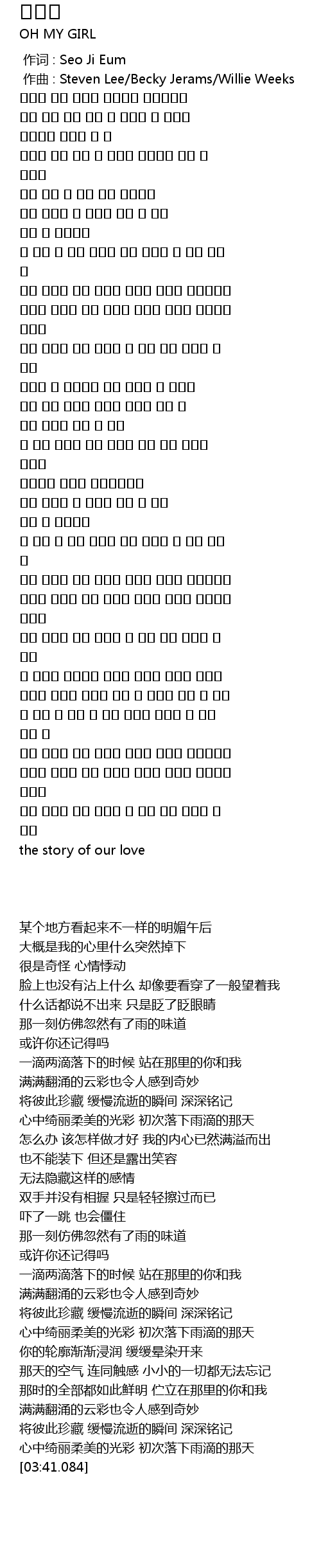 | [02:35.400] | 나의 맘속에 예쁜 파스텔 빛 비가 처음 내리던 그 날을 |