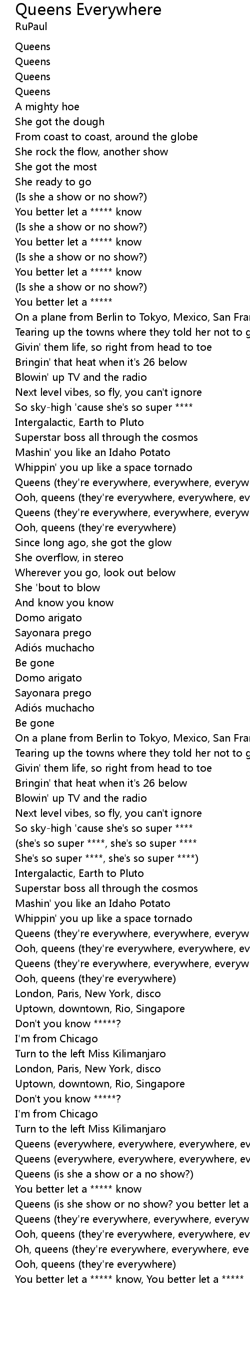 | [01:03.55] | Queens (they're everywhere, everywhere, everywhere) |