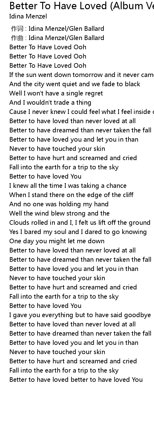 | [00:55.72] | Better to have loved you and let you in than |