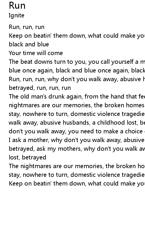 The old man's drunk again, from the hand that feeds has turned into a fist, the nightmares are our memories, the broken homes and nose that bleed, afraid to stay, nowhere to turn, domestic violence tragedies, run, run, run, why don't you walk away, abusive husbands, a childhood lost, betrayed, run, run, run, why don't you walk away, you need to make a choice cause things will never change |