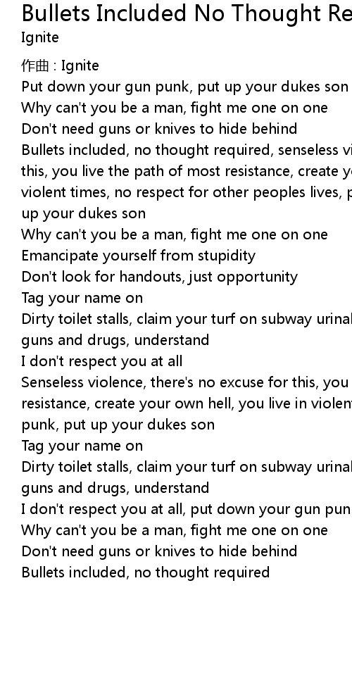 | Bullets included, no thought required, senseless violence, there' s no excuse for this, you live the path of most resistance, create your own hell, you live in violent times, no respect for other peoples lives, put down your gun punk, put up your dukes son | |