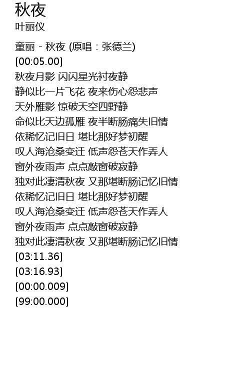 | [00:01.00] | 童丽 - 秋夜 (原唱:张德兰) |