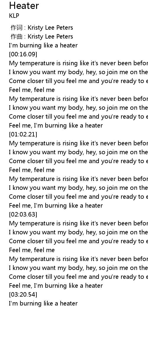| [00:57.18] | Feel me, I' m burning like a heater |