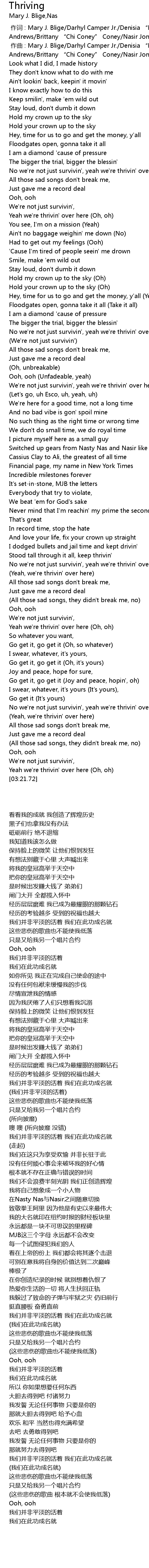 | [00:00.000] | 作词 : Mary J. Blige/Darhyl Camper Jr./Denisia “Blue June” Andrews/Brittany “Chi Coney” Coney/Nasir Jones |
