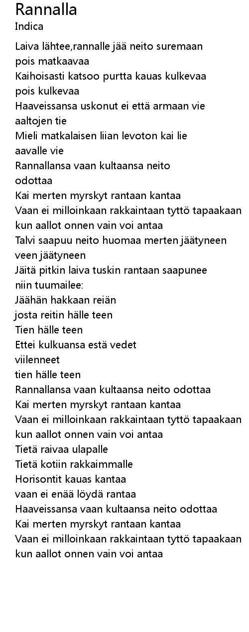 | Rannallansa vaan kultaansa neito odottaa | |