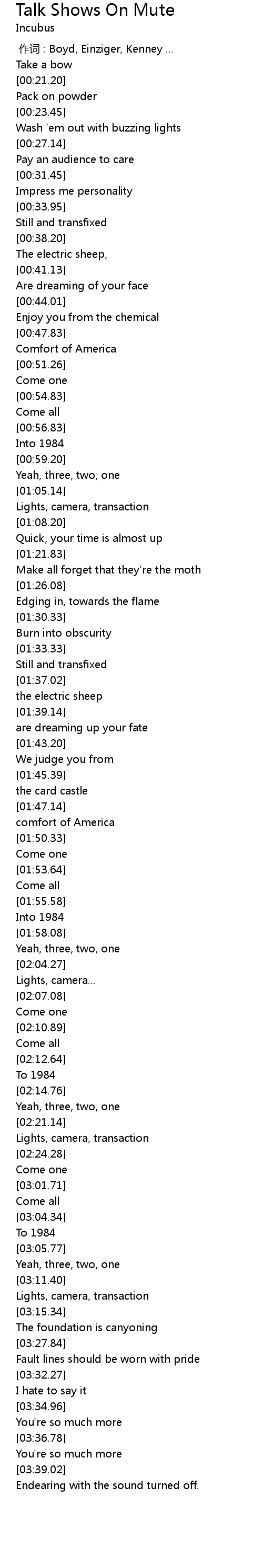 | [00:00.00] | 作词 : Boyd, Einziger, Kenney ... |