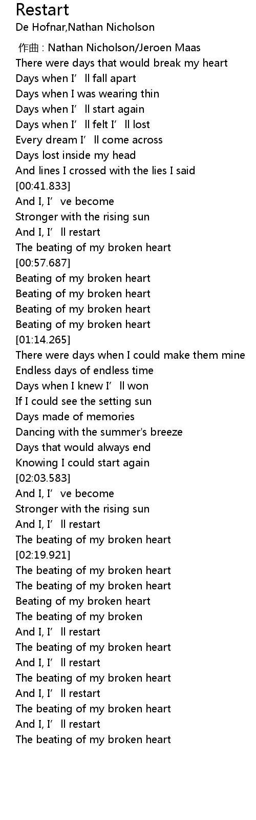 | [00:00.000] | zuo qu : Nathan Nicholson Jeroen Maas |