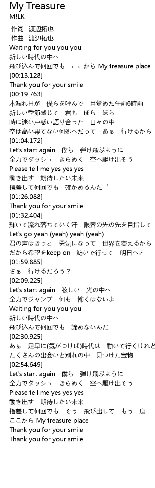 | [02:41.028] | たくさんの出会いと別れの中 見つけた宝物 |