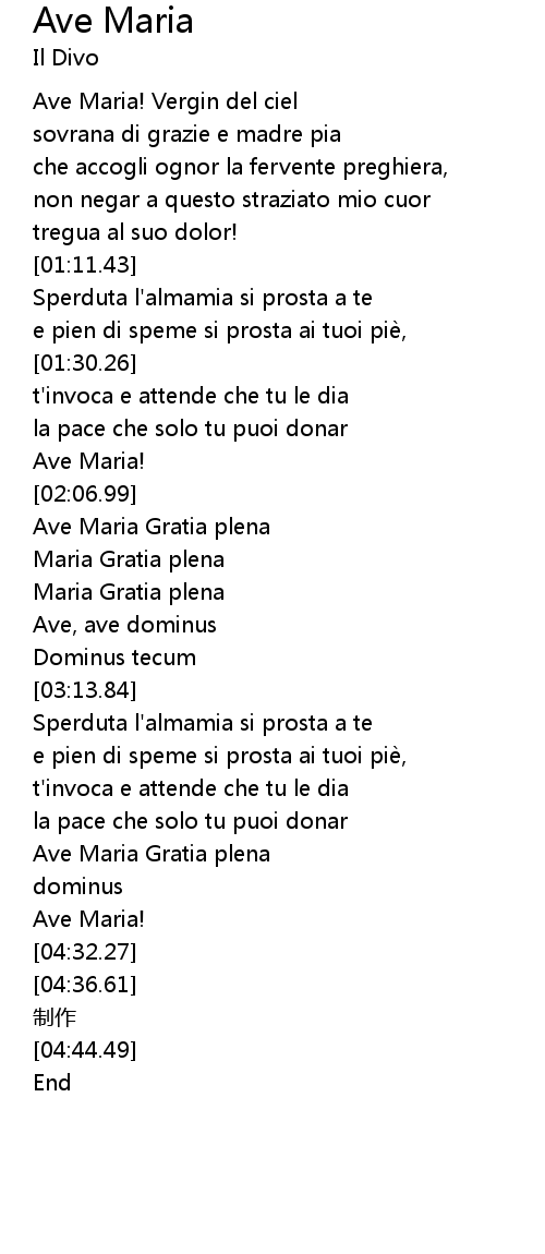| [00:19.28] | Ave Maria! Vergin del ciel |