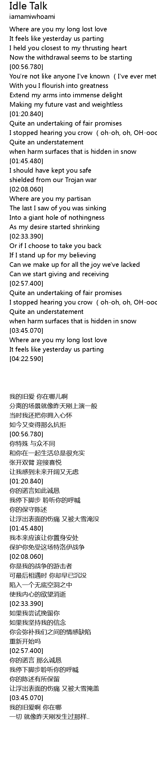 | [04:13.590] | Where are you my long lost love |