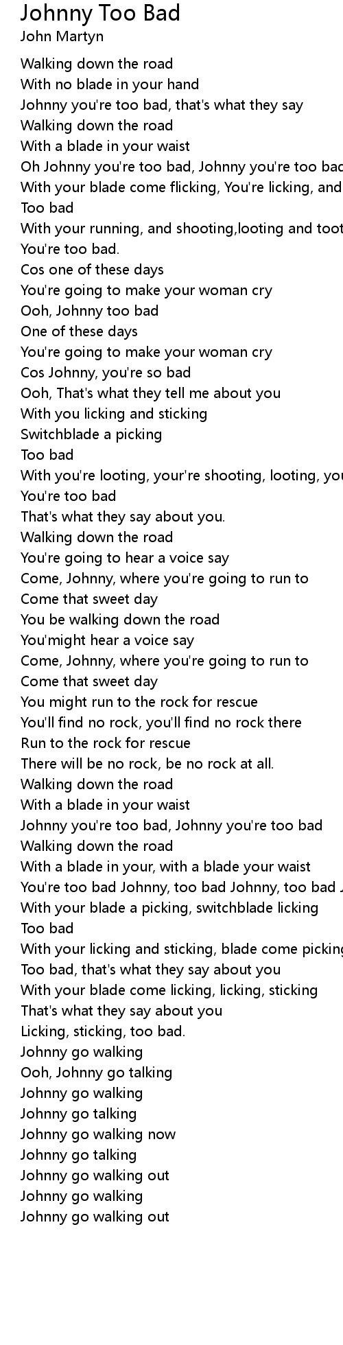 Johnny Too Bad 歌词