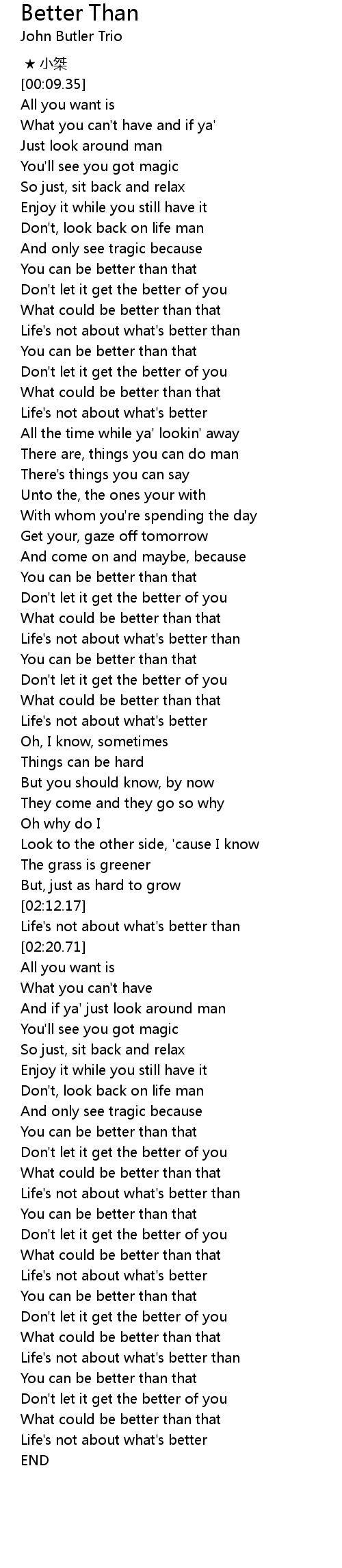 | [02:14.38] | Life' s not about what' s better than |