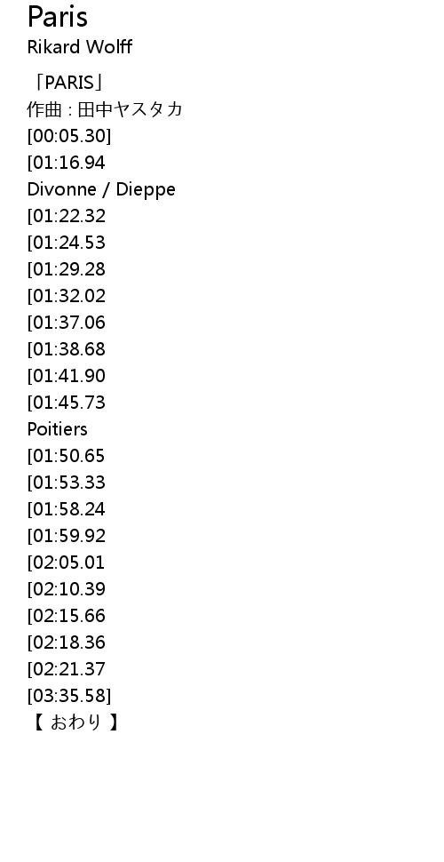 | [03:19.84][02:10.39][01:00.76] | Monttelimar / Gennevilliers / Saumur |