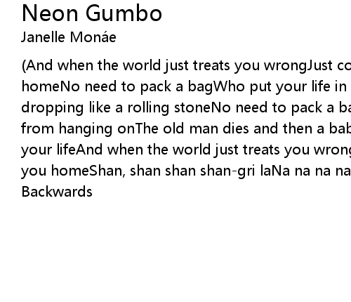 | (And when the world just treats you wrongJust come with me and I'll take you homeNo need to pack a bagWho put your life in the danger zone?You running dropping like a rolling stoneNo need to pack a bagYou just can't stop your hurt from hanging onThe old man dies and then a baby's bornChan, chan, chan, change your lifeAnd when the world just treats you wrongJust come with me and I'll take you homeShan, shan shan shan-gri laNa na na na na na na na na na na) | |