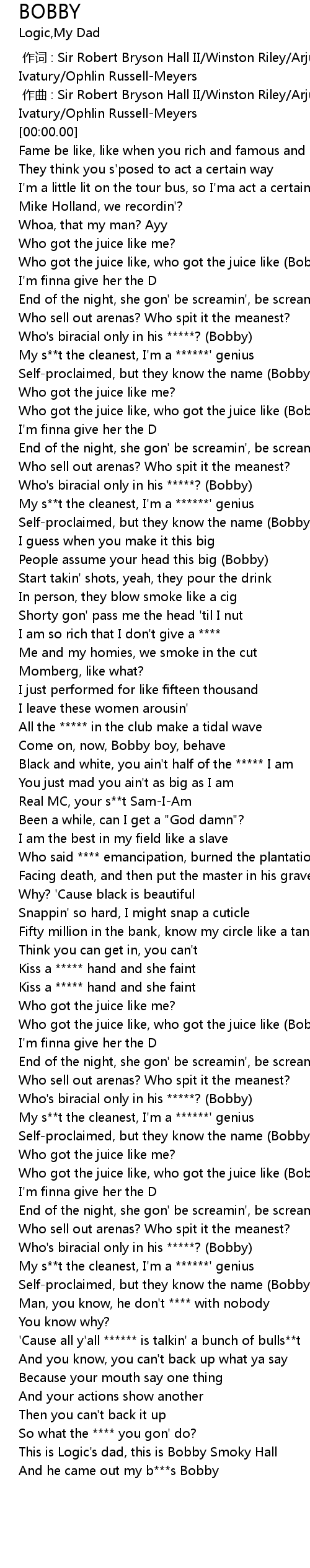 | [00:19.170] | Who got the juice like, who got the juice like Bobby |