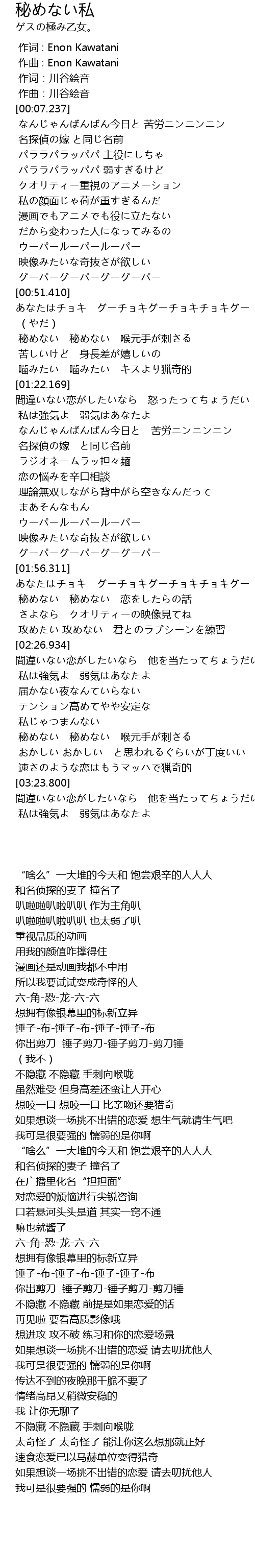 | [02:03.435] | 秘めない 秘めない 恋をしたらの話 |