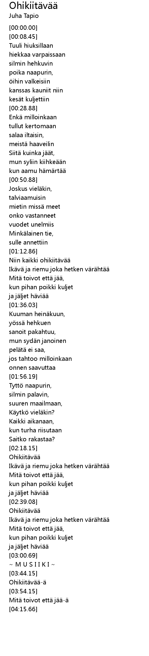 | [02:43.86] | Ikävä ja riemu joka hetken värähtää |