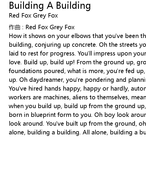 | How it shows on your elbows that you've been thinking and dreaming of building a building, conjuring up concrete. Oh the streets you've paved, the bricks you've laid to rest for progress. You'll impress upon yourself a blueprint spread for love. Build up, build up! From the ground up, ground up! Your skyscraper, foundations poured, what is more, you're fed up, fed up with your head up head up. Oh daydreamer, you're pondering and planning for her. Oh boy look around. You've hired hands happy, happy or hardly, autonomous. You tell yourself the workers are machines, aliens to themselves, means to ends you'll find a friend when you build up, build up from the ground up, ground up your lover, she's been born in blueprint form to you. Oh boy look around. You are in the clouds, oh boy look around. You've built up from the ground, oh boy look around, you're all alone, building a building. All alone, building a building. |
