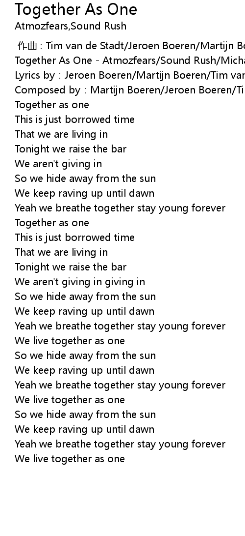 | [00:00.100] | Together As One Atmozfears Sound Rush Michael Jo |