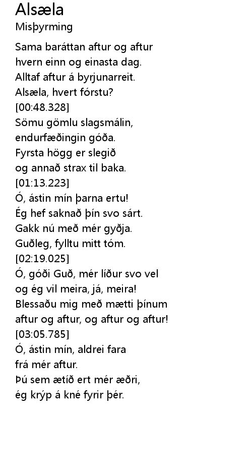 | [00:43.156] | Alsæla, hvert fórstu? |