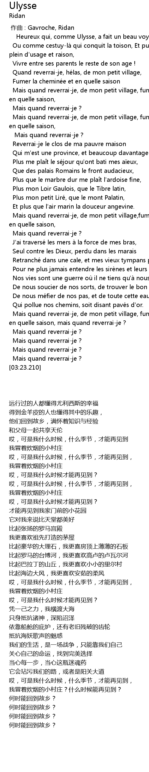 | [02:45.390] | Mais quand reverraije, de mon petit village, fumer la chemine e et en quelle saison, mais quand reverraije ? |