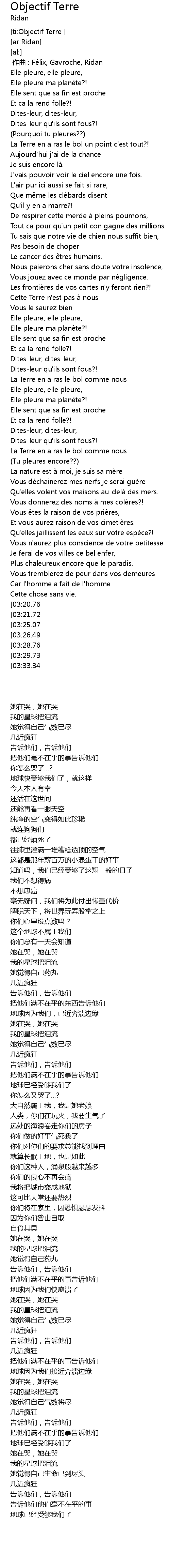 | [03:38.36][03:21.72][03:05.02][02:48.45] | Elle pleure ma planète?! |
