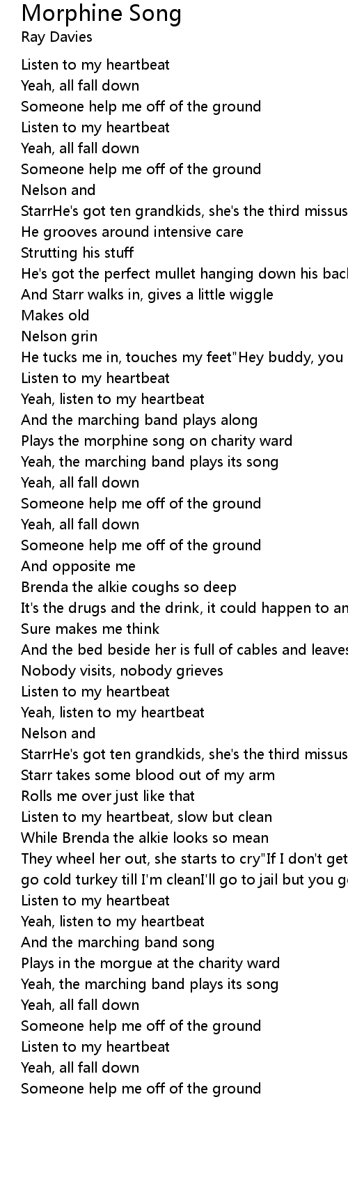 They wheel her out, she starts to cry"If I don't get better, I'm gonna dieI'll go cold turkey till I'm cleanI'll go to jail but you get the morphine" |