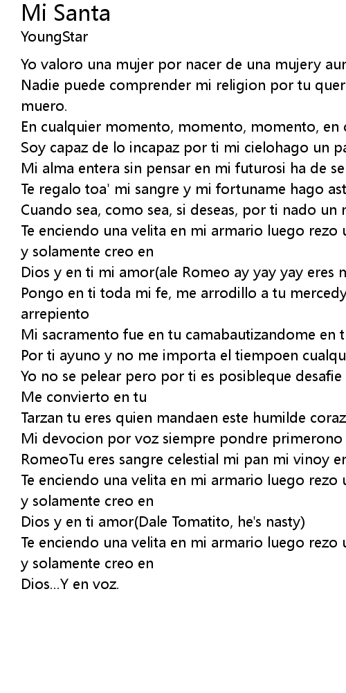 Te enciendo una velita en mi armario luego rezo una oracionporque eres mi santa y solamente creo en |