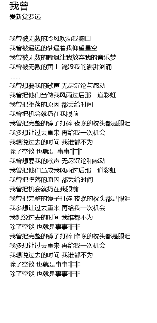 | [00:16.59] | 我曾被无数的嘲讽让我放弃我的音乐梦 |