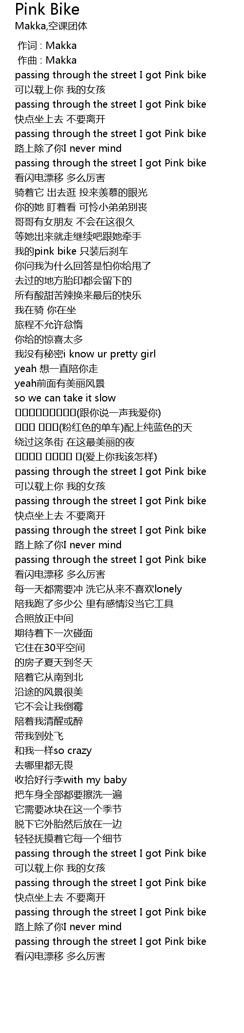 | [00:59.200] | wo de pink bike zhi zhuang hou sha che |